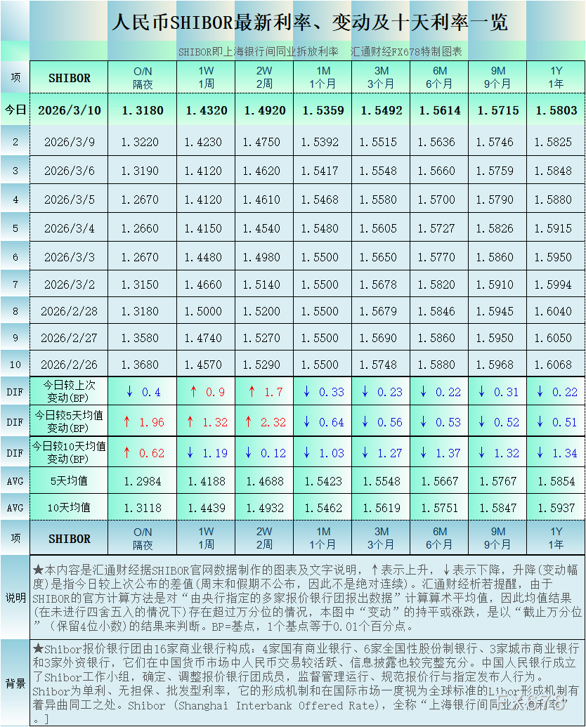 汇通财经APP讯——人民币SHIBOR(上海银行间同业拆放利率):2026年3月10日最新数据,6个周期利率下降,2个周期利率上升,其中,隔夜Shibor报1.318%,降0.4个基点。各周期“变动幅度最大”的是人民币SHIBOR的2周利率:升1.7个基点。(最近十个工作日SHIBOR及变动详见汇通FX678特制图);其他周期显示,1周Shibor报1.432%,升0.9个基点。2周Shibor报1.492%,升1.7个基点。1个月Shibor报1.5359%,降0.33个基点。3个月Shibor报1.5492%,降0.23个基点。6个月Shibor报1.5614%,降0.22个基点。9个月Shibor报1.5715%,降0.31个基点。一年Shibor报1.5803%,降0.22个基点。
