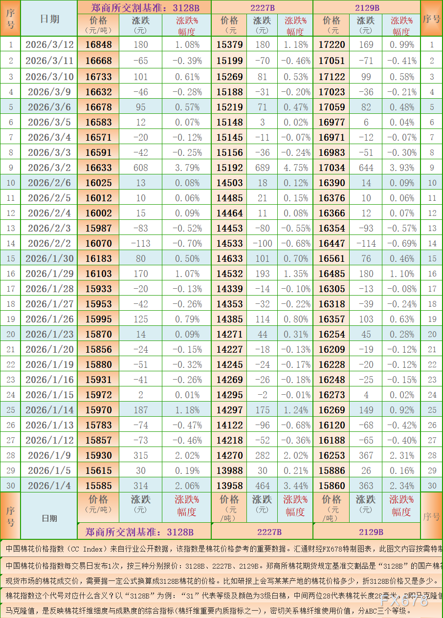 汇通财经APP讯——一张图:中国棉花价格指数(CC Index)最新(2026年3月12日)数据显示,3128B棉花价格指数报 16848 元/吨(3128B是郑商所棉花期货交割认定的基准),上升180元/吨,涨1.08%,另外,2227B棉花价格指数报 15379 元/吨,上升180元/吨,涨1.18%,2129B棉花价格指数报 17220 元/吨,上升169元/吨,涨0.99%。汇通财经FX678特制图表为您展示:中国棉花价格指数(CC Index)最新30个交易日一览。( 中国棉花价格指数每交易日发布1次,按三种分别报价:3128B、2227B、2129B。郑商所棉花期货规定基准交割品是“3128B”的国产棉花。 现货市场的棉花成交价,需要据一定公式换算成3128B棉花的价格。比如研报上会写某某产地的棉花价格多少,折3128B价格又是多少。)