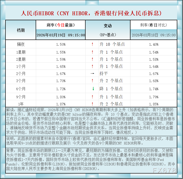 汇通财经APP讯——人民币香港银行间同业拆借利率(CNY HIBOR)及变动一览:2026年3月19日据汇通财经观察,2026年3月19日 CNY HIBOR各周期利率大多上升(如表格所示,有7个周期的利率上升)。其中变动幅度最大的是CNY hibor的隔夜利率:升 10 个基点。如图更新的数据显示,隔夜在岸人民币HIBOR报1.50%,升10个基点;1星期报1.55%,升1个基点,2星期报1.59%,升1个基点,1个月报1.65%,升1个基点,2个月报1.67%,持平,3个月报1.70%,升2个基点,6个月报1.73%,降1个基点,9个月报1.80%,升1个基点,1年在岸人民币HIBOR报1.87%,升2个基点 。BP=基点