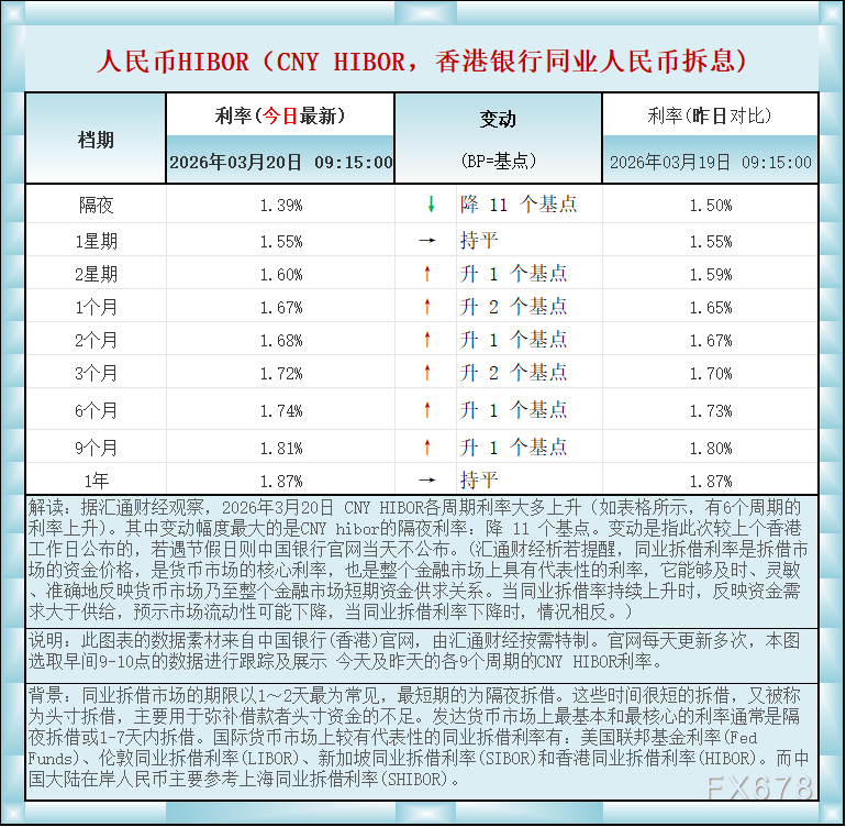 汇通财经APP讯——人民币香港银行间同业拆借利率(CNY HIBOR)及变动一览:2026年3月20日据汇通财经观察,2026年3月20日 CNY HIBOR各周期利率大多上升(如表格所示,有6个周期的利率上升)。其中变动幅度最大的是CNY hibor的隔夜利率:降 11 个基点。如图更新的数据显示,隔夜在岸人民币HIBOR报1.39%,降11个基点;1星期报1.55%,持平,2星期报1.60%,升1个基点,1个月报1.67%,升2个基点,2个月报1.68%,升1个基点,3个月报1.72%,升2个基点,6个月报1.74%,升1个基点,9个月报1.81%,升1个基点,1年在岸人民币HIBOR报1.87%,持平 。BP=基点