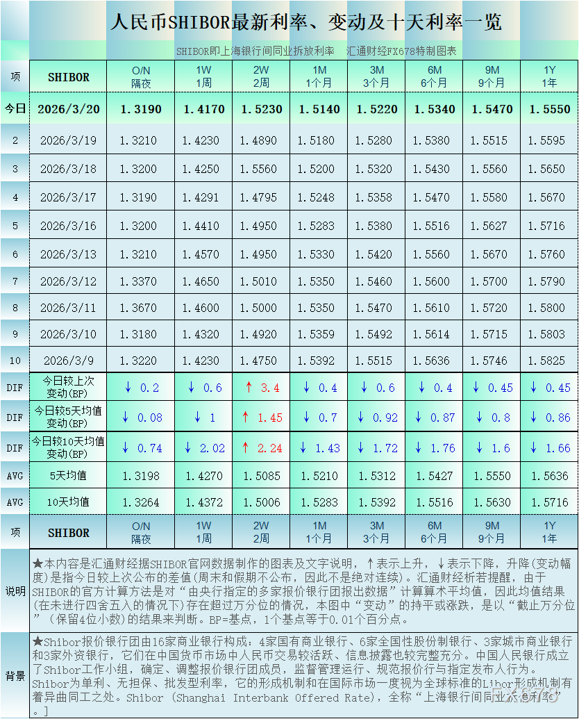 汇通财经APP讯——人民币SHIBOR(上海银行间同业拆放利率):2026年3月20日最新数据,7个周期利率下降,1个周期利率上升,其中,隔夜Shibor报1.319%,降0.2个基点。各周期“变动幅度最大”的是人民币SHIBOR的2周利率:升3.4个基点。(最近十个工作日SHIBOR及变动详见汇通FX678特制图);其他周期显示,1周Shibor报1.417%,降0.6个基点。2周Shibor报1.523%,升3.4个基点。1个月Shibor报1.514%,降0.4个基点。3个月Shibor报1.522%,降0.6个基点。6个月Shibor报1.534%,降0.4个基点。9个月Shibor报1.547%,降0.45个基点。一年Shibor报1.555%,降0.45个基点。