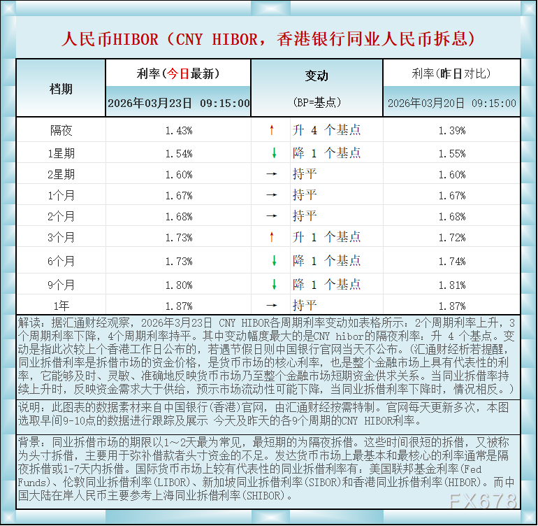 汇通财经APP讯——人民币香港银行间同业拆借利率(CNY HIBOR)及变动一览:2026年3月23日据汇通财经观察,2026年3月23日 CNY HIBOR各周期利率变动如表格所示:2个周期利率上升,3个周期利率下降,4个周期利率持平。其中变动幅度最大的是CNY hibor的隔夜利率:升 4 个基点。如图更新的数据显示,隔夜在岸人民币HIBOR报1.43%,升4个基点;1星期报1.54%,降1个基点,2星期报1.60%,持平,1个月报1.67%,持平,2个月报1.68%,持平,3个月报1.73%,升1个基点,6个月报1.73%,降1个基点,9个月报1.80%,降1个基点,1年在岸人民币HIBOR报1.87%,持平 。BP=基点