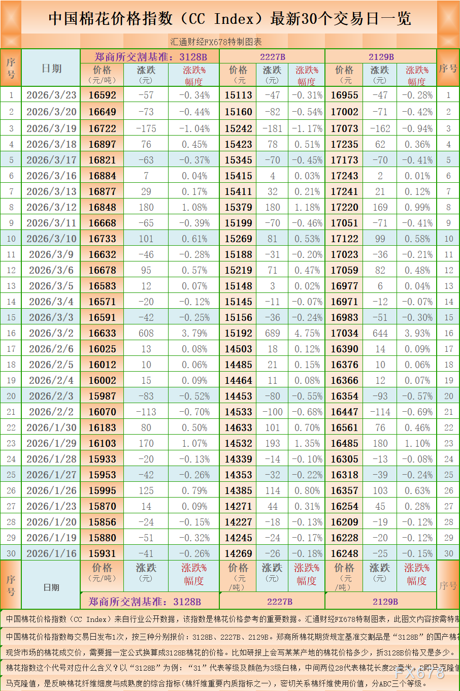 汇通财经APP讯——一张图:中国棉花价格指数(CC Index)最新(2026年3月23日)数据显示,3128B棉花价格指数报 16592 元/吨(3128B是郑商所棉花期货交割认定的基准),下降57元/吨,跌0.34%,另外,2227B棉花价格指数报 15113 元/吨,下降47元/吨,跌0.31%,2129B棉花价格指数报 16955 元/吨,下降47元/吨,跌0.28%。汇通财经FX678特制图表为您展示:中国棉花价格指数(CC Index)最新30个交易日一览。( 中国棉花价格指数每交易日发布1次,按三种分别报价:3128B、2227B、2129B。郑商所棉花期货规定基准交割品是“3128B”的国产棉花。 现货市场的棉花成交价,需要据一定公式换算成3128B棉花的价格。比如研报上会写某某产地的棉花价格多少,折3128B价格又是多少。)