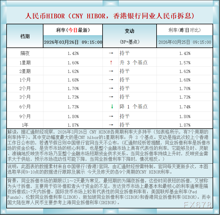 汇通财经APP讯——人民币香港银行间同业拆借利率(CNY HIBOR)及变动一览:2026年3月26日据汇通财经观察,2026年3月26日 CNY HIBOR各周期利率大多持平(如表格所示,有7个周期的利率持平)。其中变动幅度最大的是CNY hibor的1星期利率:升 3 个基点。如图更新的数据显示,隔夜在岸