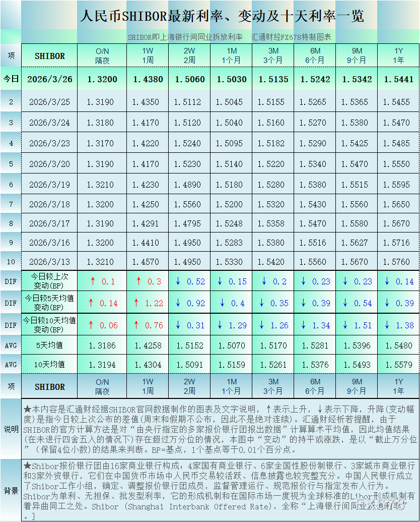 汇通财经APP讯——人民币SHIBOR(上海银行间同业拆放利率):2026年3月26日最新数据,6个周期利率下降,2个周期利率上升,其中,隔夜Shibor报1.32%,升0.1个基点。各周期“变动幅度最大”的是人民币SHIBOR的2周利率:降0.52个基点。(最近十个工作日SHIBOR及变动详见汇通FX678特制图);其他周期显示,1周Shibor报1.438%,升0.3个基点。2周Shibor报1.506%,降0.52个基点。1个月Shibor报1.503%,降0.15个基点。3个月Shibor报1.5135%,降0.2个基点。6个月Shibor报1.5242%,降0.23个基点。9个月Shibor报1.5342%,降0.23个基点。一年Shibor报1.5441%,降0.14个基点。