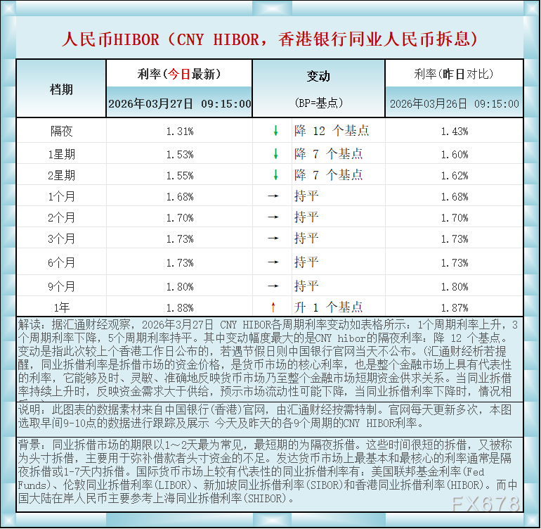 汇通财经APP讯——人民币香港银行间同业拆借利率(CNY HIBOR)及变动一览:2026年3月27日据汇通财经观察,2026年3月27日 CNY HIBOR各周期利率变动如表格所示:1个周期利率上升,3个周期利率下降,5个周期利率持平。其中变动幅度最大的是CNY hibor的隔夜利率:降 12 个基点。如图更新的数据显示,隔夜在岸人民币HIBOR报1.31%,降12个基点;1星期报1.53%,降7个基点,2星期报1.55%,降7个基点,1个月报1.68%,持平,2个月报1.70%,持平,3个月报1.73%,持平,6个月报1.73%,持平,9个月报1.80%,持平,1年在岸人民币HIBOR报1.88%,升1个基点 。BP=基点
