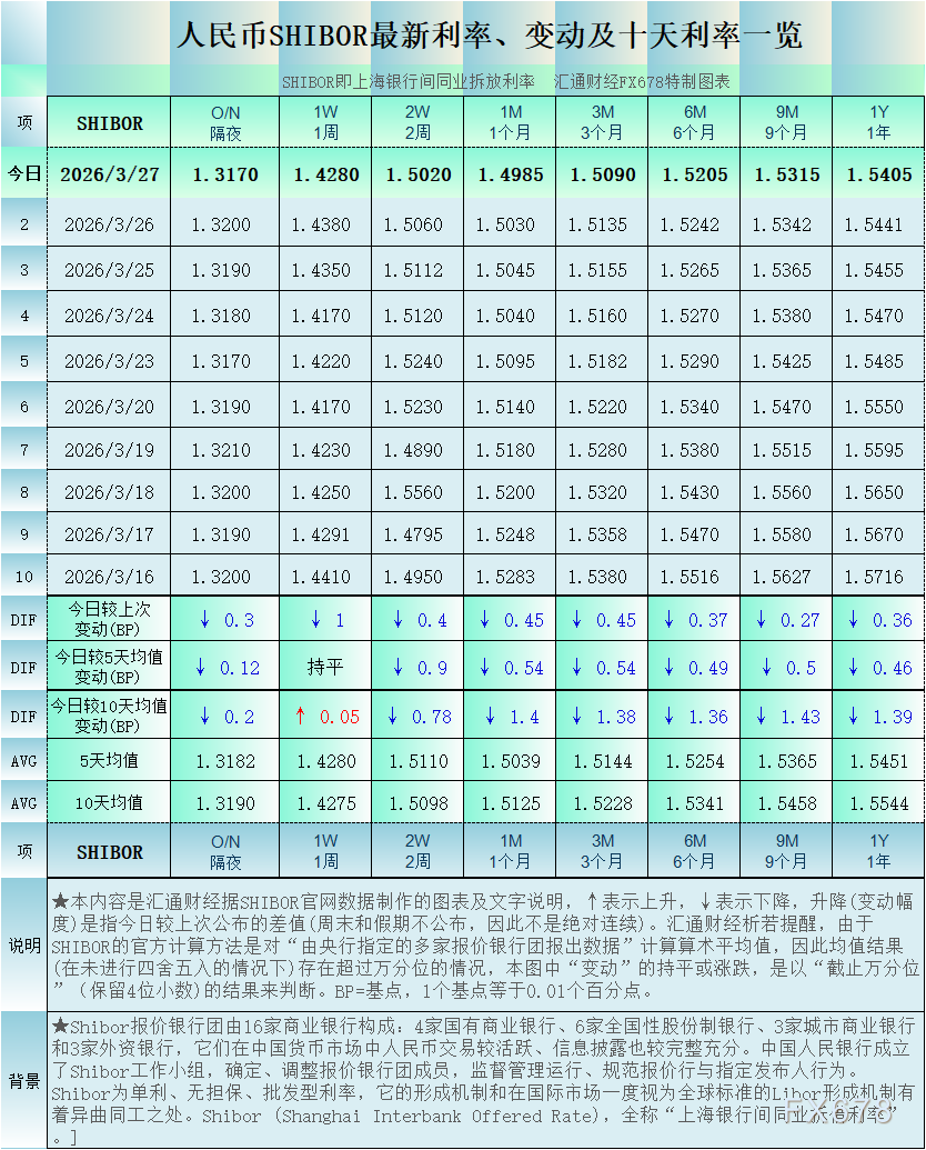 汇通财经APP讯——人民币SHIBOR(上海银行间同业拆放利率):2026年3月27日最新数据,8个周期利率下降,其中,隔夜Shibor报1.317%,降0.3个基点。各周期“变动幅度最大”的是人民币SHIBOR的1周利率:降1个基点。(最近十个工作日SHIBOR及变动详见汇通FX678特制图);其他周期显示,1周Shibor报1.428%,降1个基点。2周Shibor报1.502%,降0.4个基点。1个月Shibor报1.4985%,降0.45个基点。3个月Shibor报1.509%,降0.45个基点。6个月Shibor报1.5205%,降0.37个基点。9个月Shibor报1.5315%,降0.27个基点。一年Shibor报1.5405%,降0.36个基点。