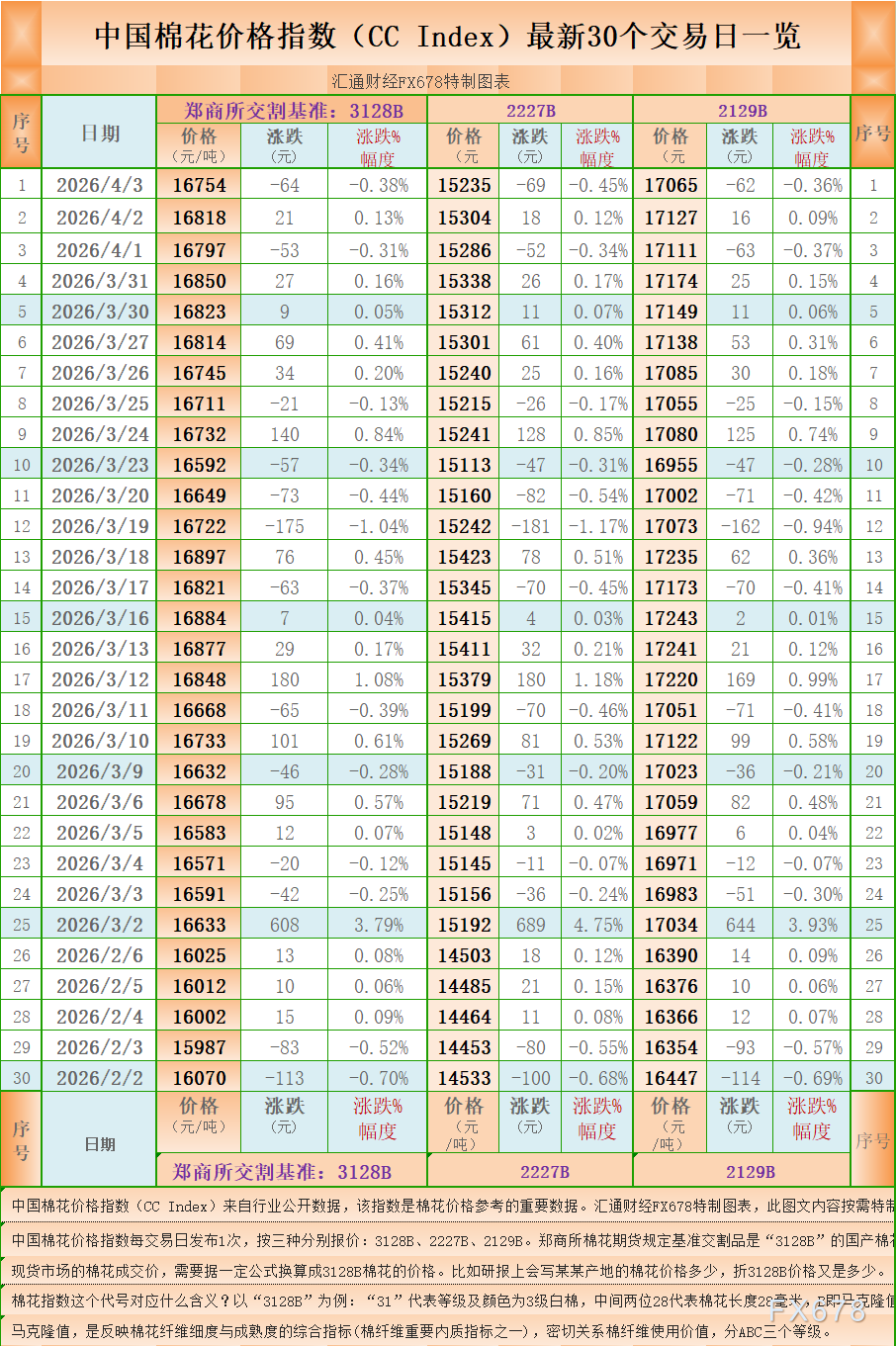 汇通财经APP讯——一张图:中国棉花价格指数(CC Index)最新(2026年4月3日)数据显示,3128B棉花价格指数报 16754 元/吨(3128B是郑商所棉花期货交割认定的基准),下降64元/吨,跌0.38%,另外,2227B棉花价格指数报 15235 元/吨,下降69元/吨,跌0.45%,2129B棉花价格指数报 17065 元/吨,下降62元/吨,跌0.36%。汇通财经FX678特制图表为您展示:中国棉花价格指数(CC Index)最新30个交易日一览。( 中国棉花价格指数每交易日发布1次,按三种分别报价:3128B、2227B、2129B。郑商所棉花期货规定基准交割品是“3128B”的国产棉花。 现货市场的棉花成交价,需要据一定公式换算成3128B棉花的价格。比如研报上会写某某产地的棉花价格多少,折3128B价格又是多少。)