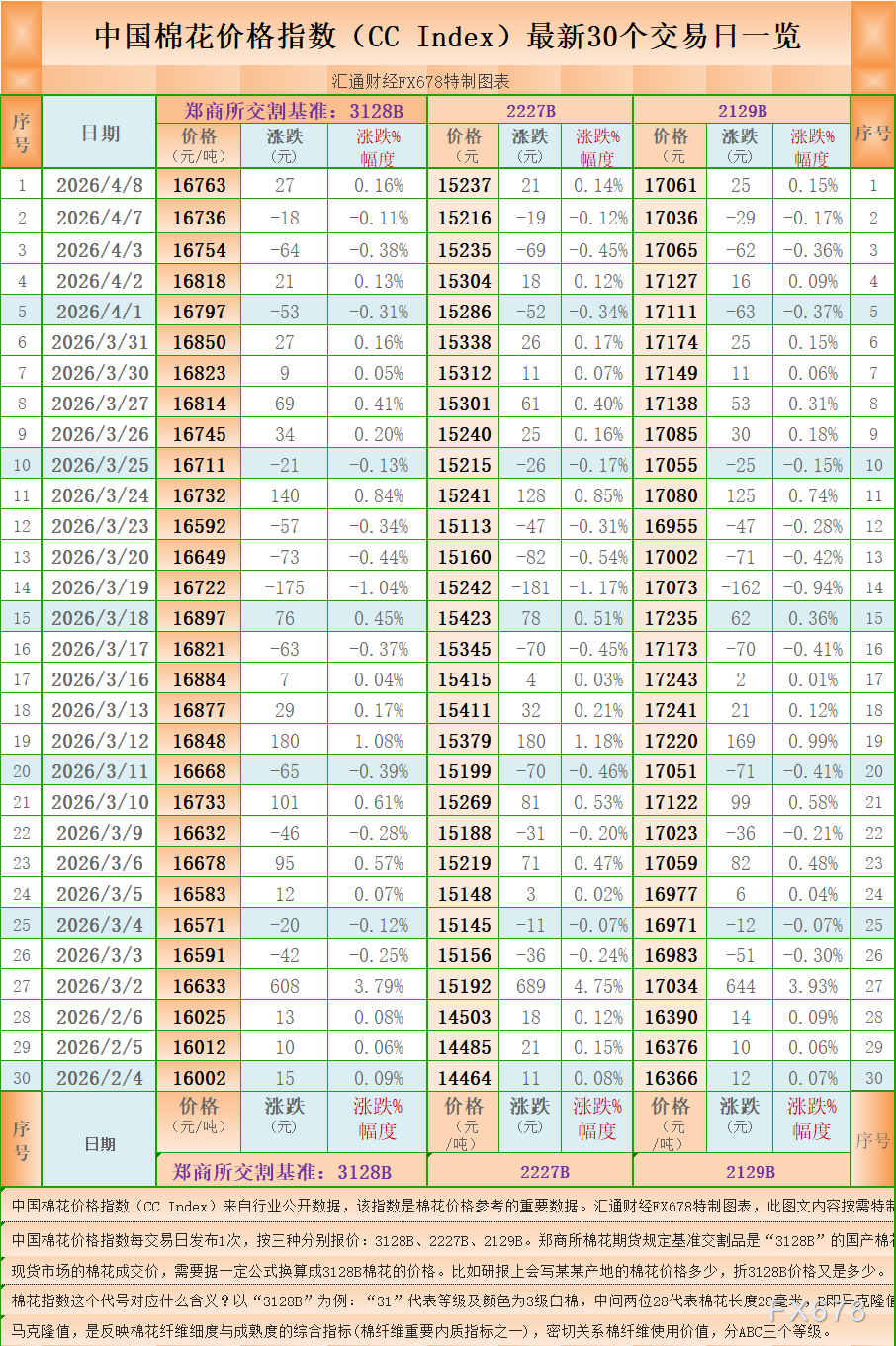 汇通财经APP讯——一张图:中国棉花价格指数(CC Index)最新(2026年4月8日)数据显示,3128B棉花价格指数报 16763 元/吨(3128B是郑商所棉花期货交割认定的基准),上升27元/吨,涨0.16%,另外,2227B棉花价格指数报 15237 元/吨,上升21元/吨,涨0.14%,2129B棉花价格指数报 17061 元/吨,上升25元/吨,涨0.15%。汇通财经FX678特制图表为您展示:中国棉花价格指数(CC Index)最新30个交易日一览。( 中国棉花价格指数每交易日发布1次,按三种分别报价:3128B、2227B、2129B。郑商所棉花期货规定基准交割品是“3128B”的国产棉花。 现货市场的棉花成交价,需要据一定公式换算成3128B棉花的价格。比如研报上会写某某产地的棉花价格多少,折3128B价格又是多少。)
