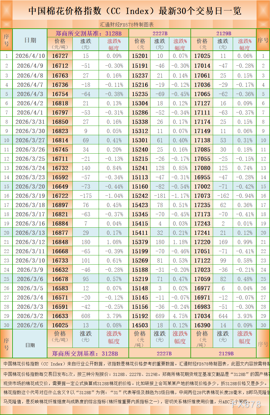 汇通财经APP讯——一张图:中国棉花价格指数(CC Index)最新(2026年4月10日)数据显示,3128B棉花价格指数报 16727 元/吨(3128B是郑商所棉花期货交割认定的基准),上升15元/吨,涨0.09%,另外,2227B棉花价格指数报 15201 元/吨,上升10元/吨,涨0.07%,2129B棉花价格指数报 17025 元/吨,上升11元/吨,涨0.06%。汇通财经FX678特制图表为您展示:中国棉花价格指数(CC Index)最新30个交易日一览。( 中国棉花价格指数每交易日发布1次,按三种分别报价:3128B、2227B、2129B。郑商所棉花期货规定基准交割品是“3128B”的国产棉花。 现货市场的棉花成交价,需要据一定公式换算成3128B棉花的价格。比如研报上会写某某产地的棉花价格多少,折3128B价格又是多少。)