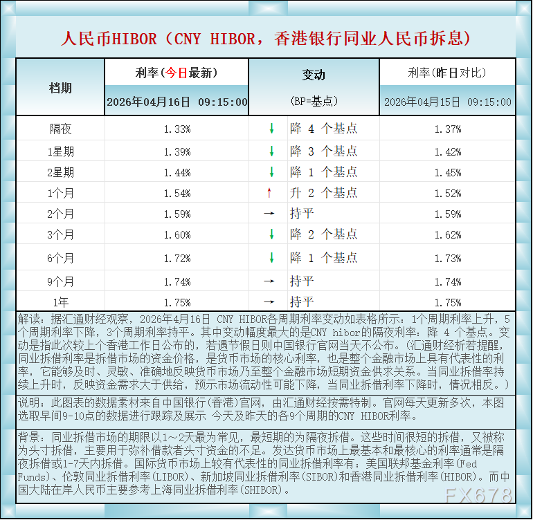汇通财经APP讯——人民币香港银行间同业拆借利率(CNY HIBOR)及变动一览:2026年4月16日据汇通财经观察,2026年4月16日 CNY HIBOR各周期利率变动如表格所示:1个周期利率上升,5个周期利率下降,3个周期利率持平。其中变动幅度最大的是CNY hibor的隔夜利率:降 4 个基点。如图更新的数据显示,隔夜在岸人民币HIBOR报1.33%,降4个基点;1星期报1.39%,降3个基点,2星期报1.44%,降1个基点,1个月报1.54%,升2个基点,2个月报1.59%,持平,3个月报1.60%,降2个基点,6个月报1.72%,降1个基点,9个月报1.74%,持平,1年在岸人民币HIBOR报1.75%,持平 。BP=基点