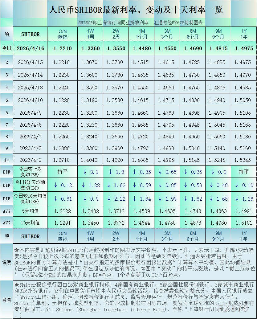 汇通财经APP讯——人民币SHIBOR(上海银行间同业拆放利率):2026年4月16日最新数据,6个周期利率下降,2个周期利率持平,其中,隔夜Shibor报1.221%,持平。各周期“变动幅度最大”的是人民币SHIBOR的1周利率:降3.1个基点。(最近十个工作日SHIBOR及变动详见汇通FX678特制图);其他周期显示,1周Shibor报1.336%,降3.1个基点。2周Shibor报1.355%,降1.8个基点。1个月Shibor报1.448%,降0.35个基点。3个月Shibor报1.455%,降0.65个基点。6个月Shibor报1.469%,降0.35个基点。9个月Shibor报1.4815%,降0.2个基点。一年Shibor报1.4975%,持平。