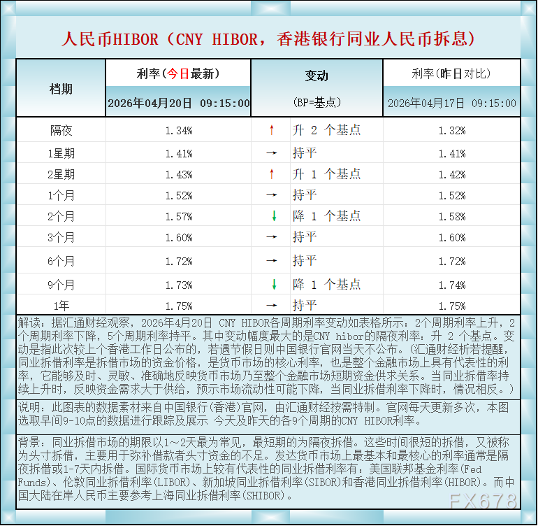 汇通财经APP讯——人民币香港银行间同业拆借利率(CNY HIBOR)及变动一览:2026年4月20日据汇通财经观察,2026年4月20日 CNY HIBOR各周期利率变动如表格所示:2个周期利率上升,2个周期利率下降,5个周期利率持平。其中变动幅度最大的是CNY hibor的隔夜利率:升 2 个基点。如图更新的数据显示,隔夜在岸人民币HIBOR报1.34%,升2个基点;1星期报1.41%,持平,2星期报1.43%,升1个基点,1个月报1.52%,持平,2个月报1.57%,降1个基点,3个月报1.60%,持平,6个月报1.72%,持平,9个月报1.73%,降1个基点,1年在岸人民币HIBOR报1.75%,持平 。BP=基点