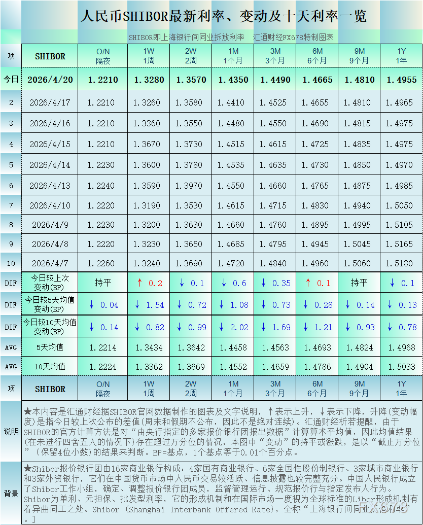 汇通财经APP讯——人民币SHIBOR(上海银行间同业拆放利率):2026年4月20日最新数据,4个周期利率下降,2个周期利率上升,2个周期利率持平,其中,隔夜Shibor报1.221%,持平。各周期“变动幅度最大”的是人民币SHIBOR的1个月利率:降0.6个基点。(最近十个工作日SHIBOR及变动详见汇通FX678特制图);其他周期显示,1周Shibor报1.328%,升0.2个基点。2周Shibor报1.357%,降0.1个基点。1个月Shibor报1.435%,降0.6个基点。3个月Shibor报1.449%,降0.35个基点。6个月Shibor报1.4665%,升0.1个基点。9个月Shibor报1.481%,持平。一年Shibor报1.4955%,降0.1个基点。