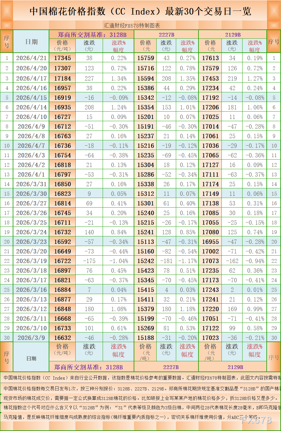 汇通财经APP讯——一张图:中国棉花价格指数(CC Index)最新(2026年4月21日)数据显示,3128B棉花价格指数报 17345 元/吨(3128B是郑商所棉花期货交割认定的基准),上升38元/吨,涨0.22%,另外,2227B棉花价格指数报 15759 元/吨,上升43元/吨,涨0.27%,2129B棉花价格指数报 17613 元/吨,上升34元/吨,涨0.19%。汇通财经FX678特制图表为您展示:中国棉花价格指数(CC Index)最新30个交易日一览。( 中国棉花价格指数每交易日发布1次,按三种分别报价:3128B、2227B、2129B。郑商所棉花期货规定基准交割品是“3128B”的国产棉花。 现货市场的棉花成交价,需要据一定公式换算成3128B棉花的价格。比如研报上会写某某产地的棉花价格多少,折3128B价格又是多少。)