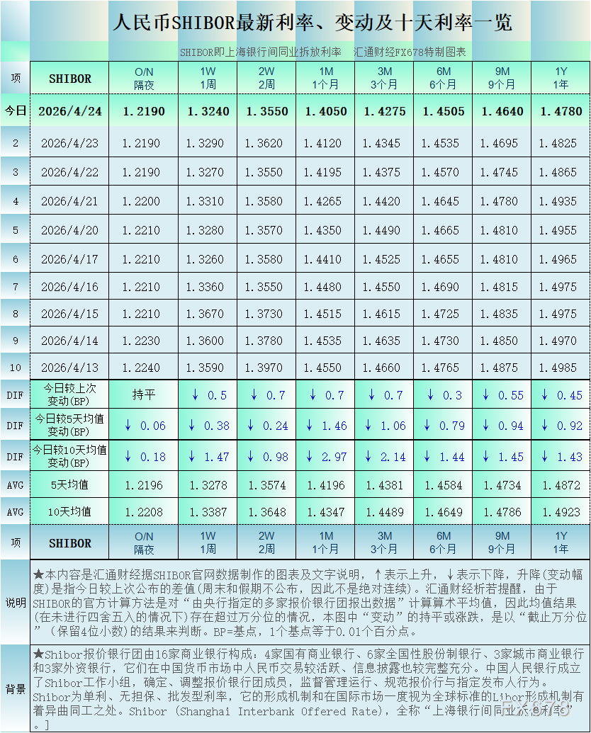 汇通财经APP讯——人民币SHIBOR(上海银行间同业拆放利率):2026年4月24日最新数据,7个周期利率下降,1个周期利率持平,其中,隔夜Shibor报1.219%,持平。各周期“变动幅度最大”的是人民币SHIBOR的2周利率:降0.7个基点。(最近十个工作日SHIBOR及变动详见汇通FX678特制图);其他周期显示,1周Shibor报1.324%,降0.5个基点。2周Shibor报1.355%,降0.7个基点。1个月Shibor报1.405%,降0.7个基点。3个月Shibor报1.4275%,降0.7个基点。6个月Shibor报1.4505%,降0.3个基点。9个月Shibor报1.464%,降0.55个基点。一年Shibor报1.478%,降0.45个基点。
