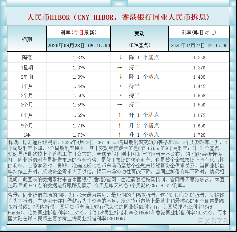 汇通财经APP讯——人民币香港银行间同业拆借利率(CNY HIBOR)及变动一览:2026年4月28日据汇通财经观察,2026年4月28日 CNY HIBOR各周期利率变动如表格所示:3个周期利率上升,2个周期利率下降,4个周期利率持平。其中变动幅度最大的是CNY hibor的9个月利率:升 2 个基点。如图更新的数据显示,隔夜在岸人民币HIBOR报1.34%,降1个基点;1星期报1.37%,持平,2星期报1.39%,降1个基点,1个月报1.44%,持平,2个月报1.56%,持平,3个月报1.59%,持平,6个月报1.68%,升1个基点,9个月报1.71%,升2个基点,1年在岸人民币HIBOR报1.73%,升1个基点 。BP=基点